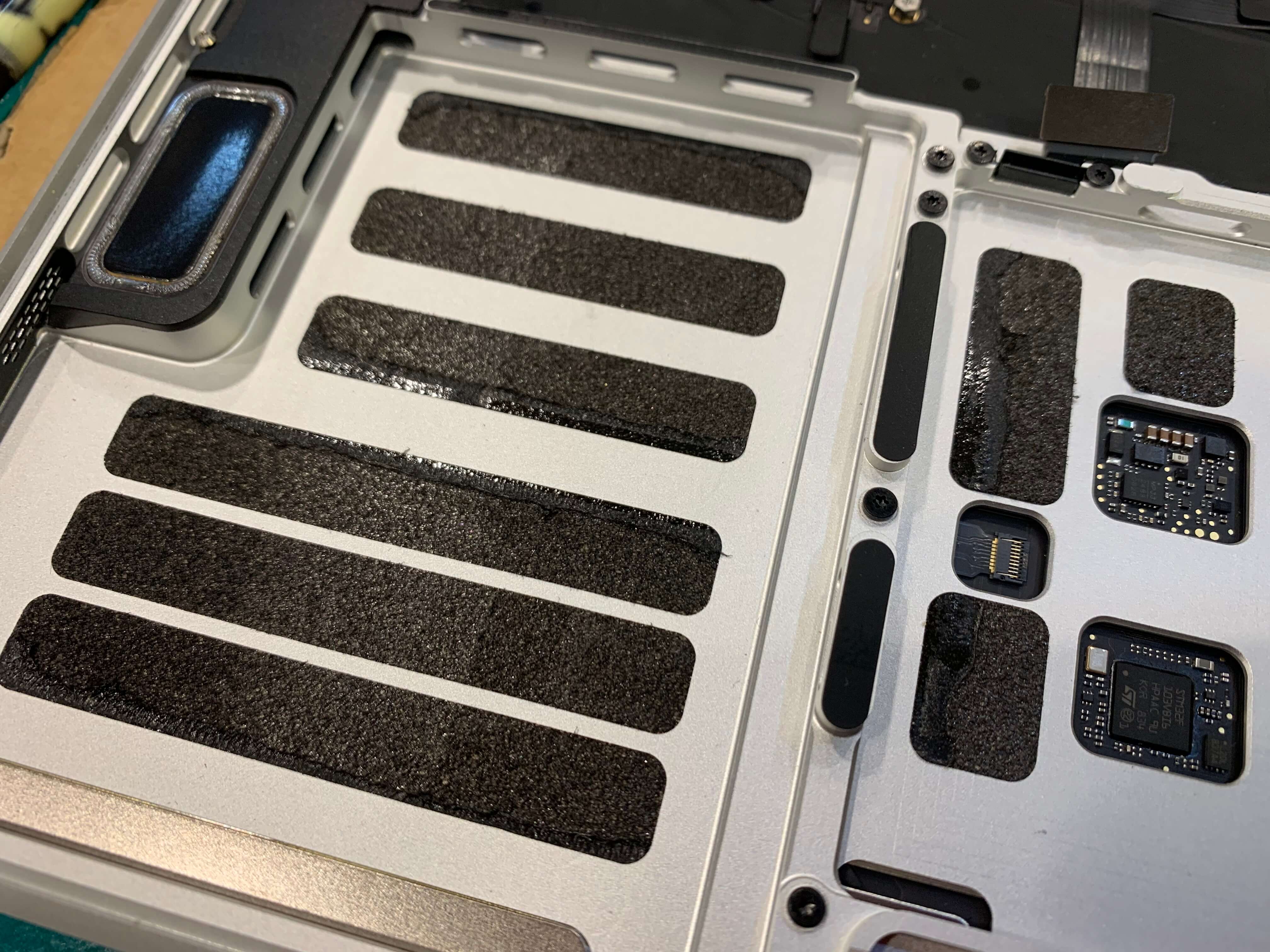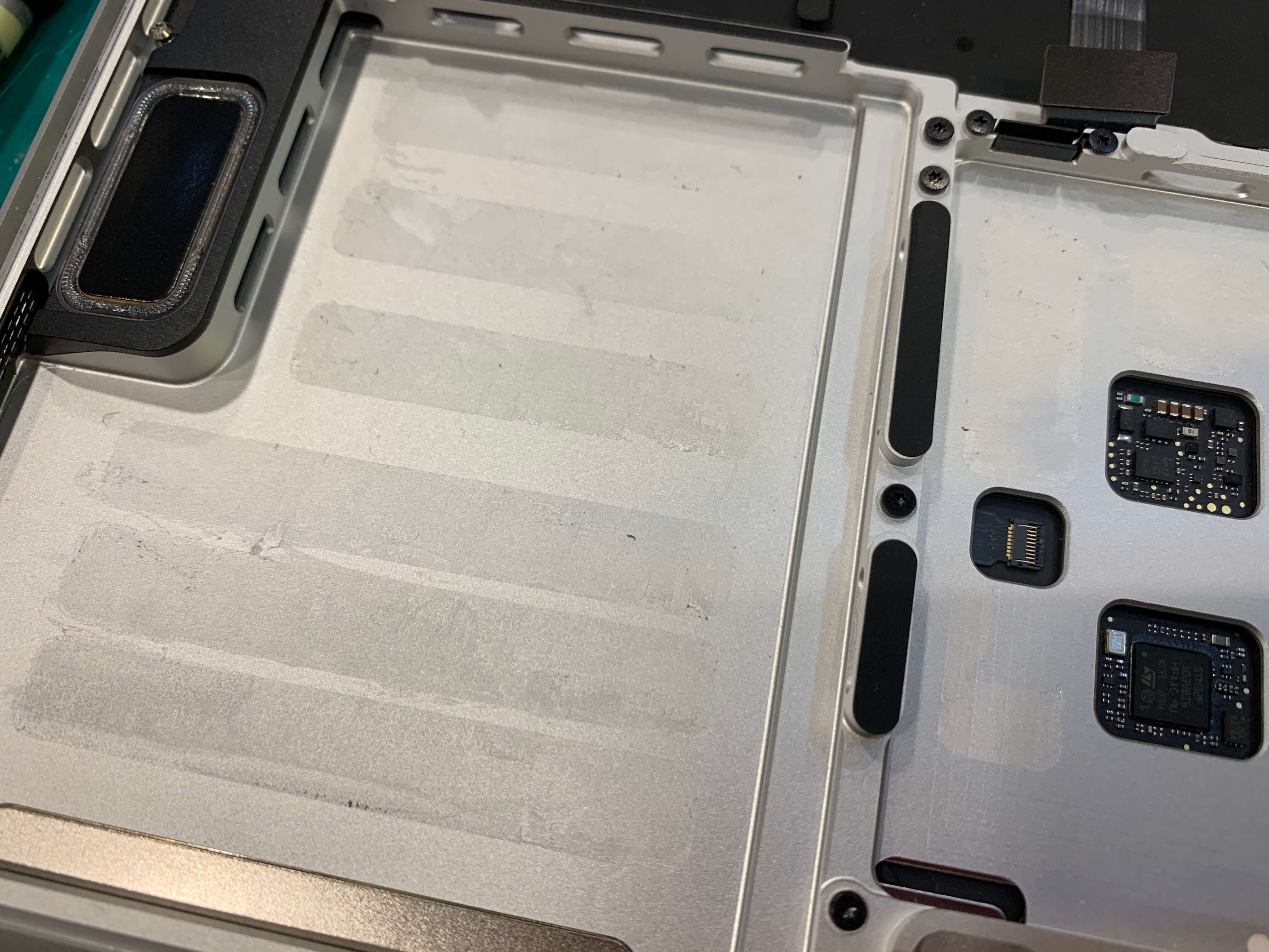 맥북 배터리가 붙어 있던 자리에 검정색 양면 테이프가 있는 것을 볼수 있습니다.