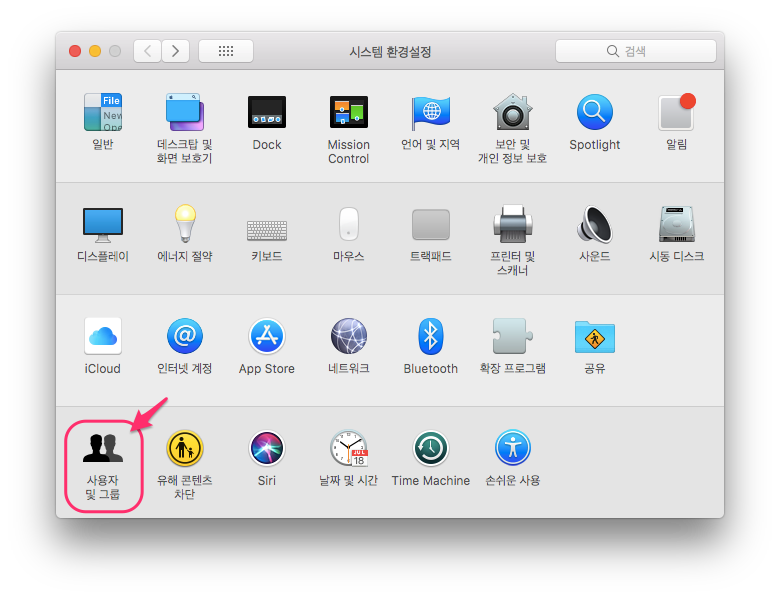 13. 시스템 환경설정으로 들어가 사용자 계정 및 그룹 설정을 엽니다.