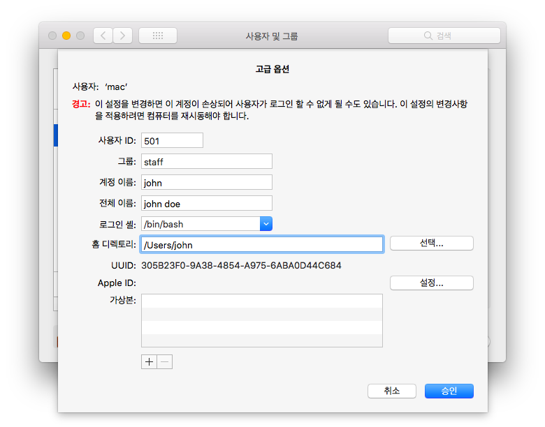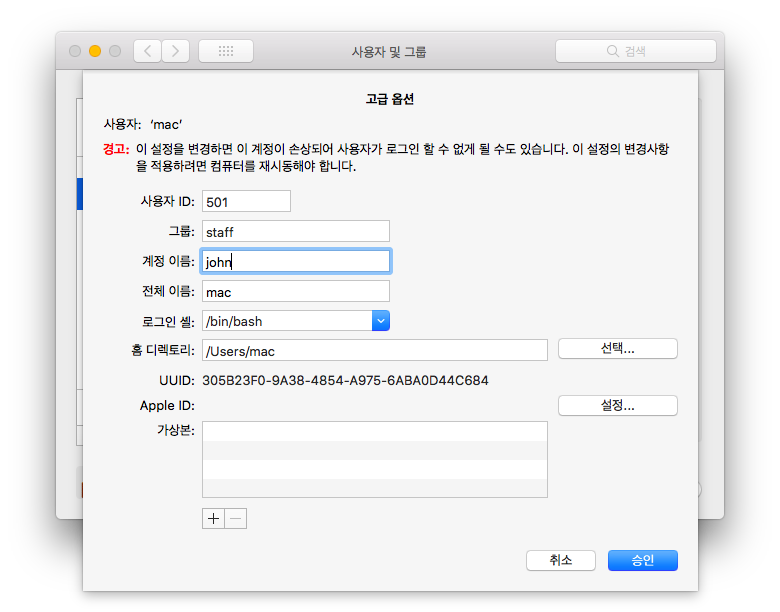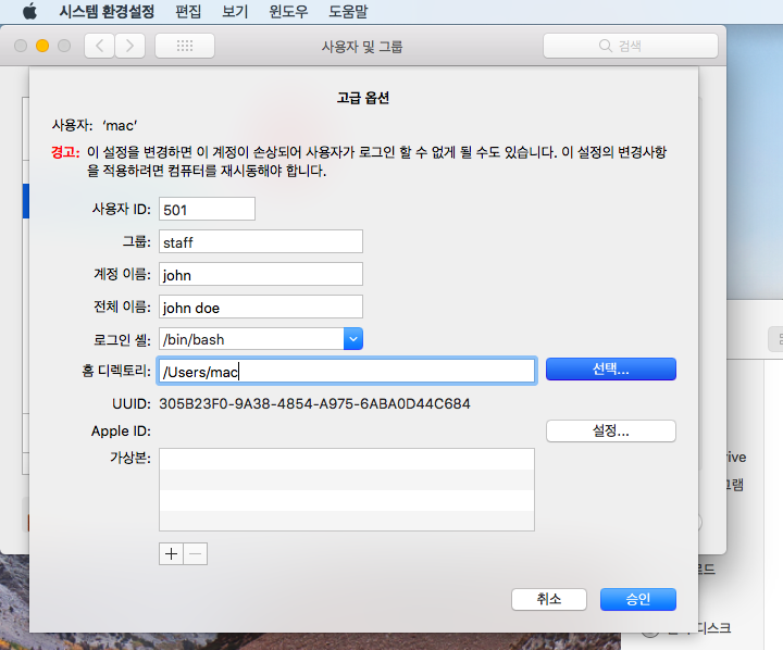 - 하이시에라 (macOS 10.13.X)에서 발생하며, 모하비에서는 로그인 계정의 홈 폴더 경로 수정을 하지 못하게 막아놨으므로 해당 이슈는 발생하지않습니다.