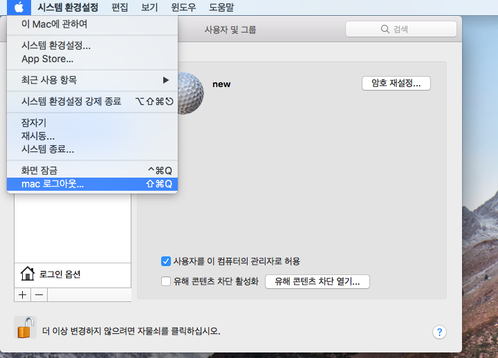 6. 새 계정을 생성했으면 기존 계정에서 로그아웃 합니다.