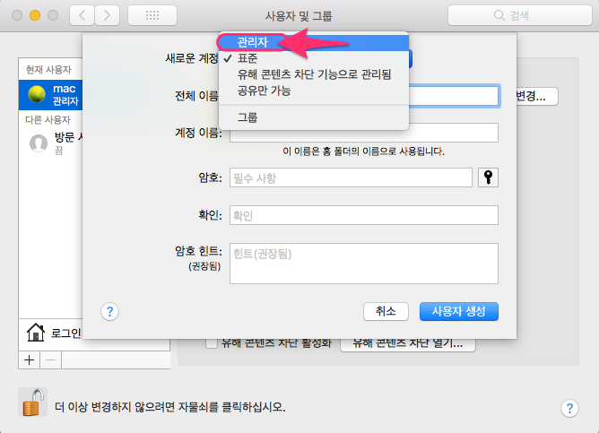 4. "표준사용자" 라고 되어있는 부분을 관리자로 변경합니다.