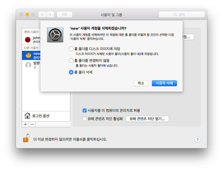 19. 시스템 환경설정 -> 사용자 계정 설정 메뉴의 하단 – 버튼을 눌러, 임시로 만들었던 계정을 삭제합니다.