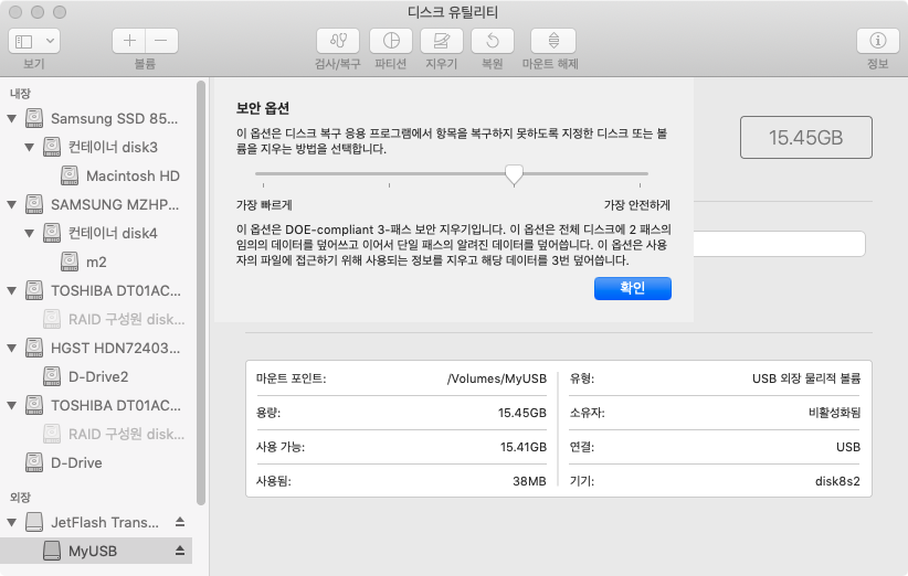 이 옵션으로 16기가를 지우는데 소요된 시간은 약 20분 걸렸습니다.