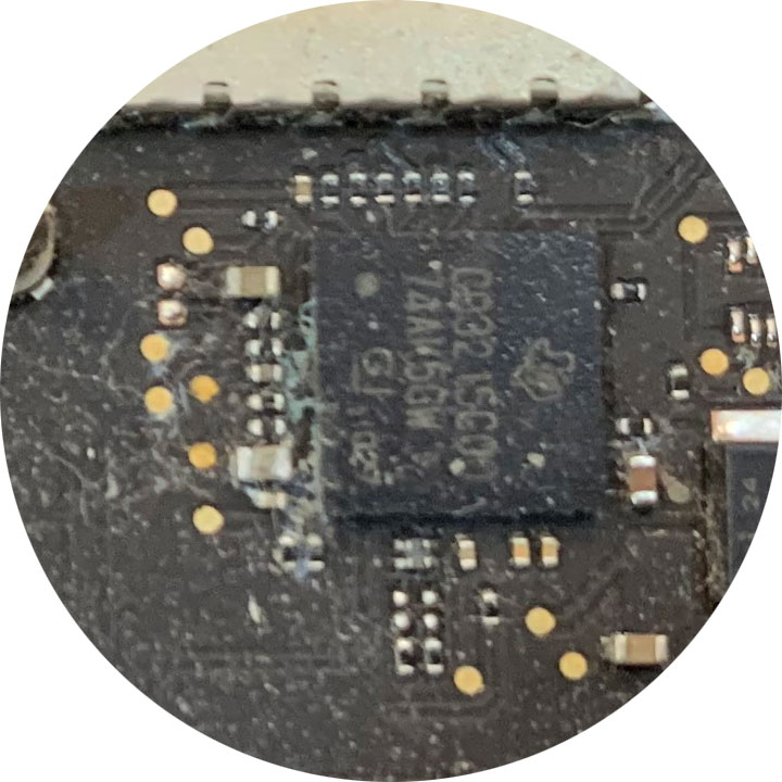 좀더 확대해 보면 CD3215 칩셋 부분 왼쪽에 푸른 빛의 먼지 같은게 보이실텐데, 이 IC의 역할은 usb-c 케이블을 연결해서 충전을 하거나, 외장하드를 연결할떄 신호를 주고받는 통신단 이라고 이해하시면 됩니다