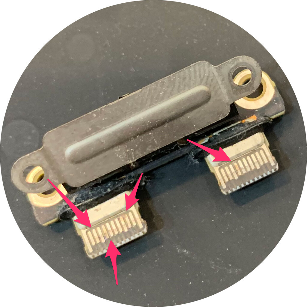 충전단자 부분을 확대해 보니 커피의 잔여물이 단자와 단자 사이에 얼룩지고, 연결된 상태라는 것을 알수 있습니다