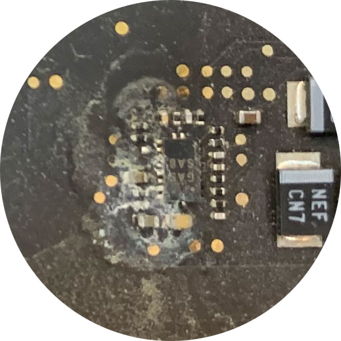 침수된 로직보드의 뒷면에도 잘못 보면 지나칠 정도의 아주 작은 침수의 흔적이 보이는 것을 알수 있습니다.