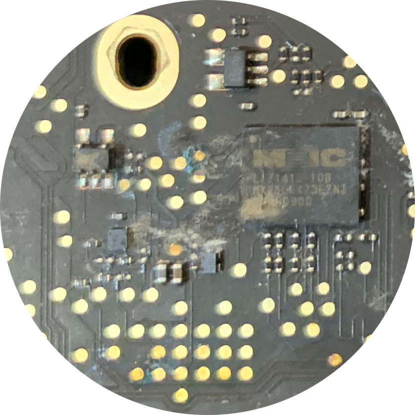 위 부분만 확대를 해보면 검정색 IC 주변에 푸릇 푸릇한 먼지 같은게 보이는데, 이것이 침수로 인해서 부식 혹은 작을 폭발을 했다는 증거 입니다.