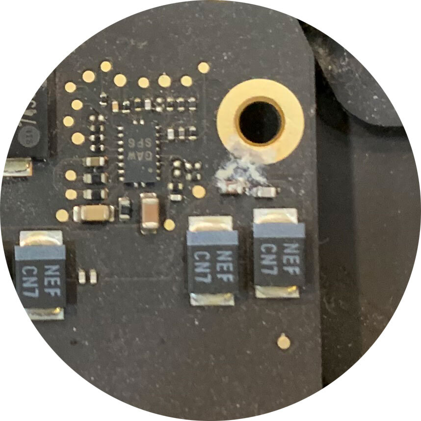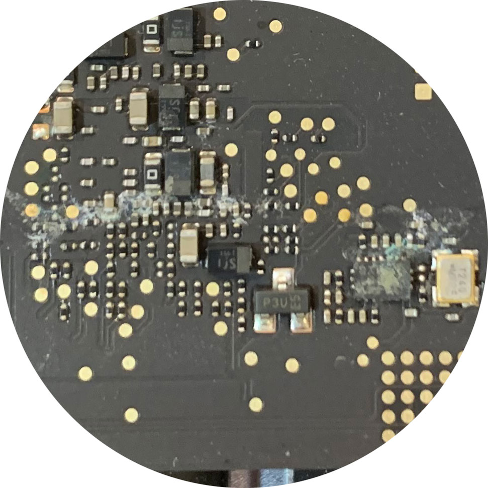 좀더 확대해 보면 CD3215 칩셋 부분 왼쪽에 푸른 빛의 먼지 같은게 보이실텐데, 이 IC의 역할은 usb-c 케이블을 연결해서 충전을 하거나, 외장하드를 연결할떄 신호를 주고받는 통신단 이라고 이해하시면 됩니다