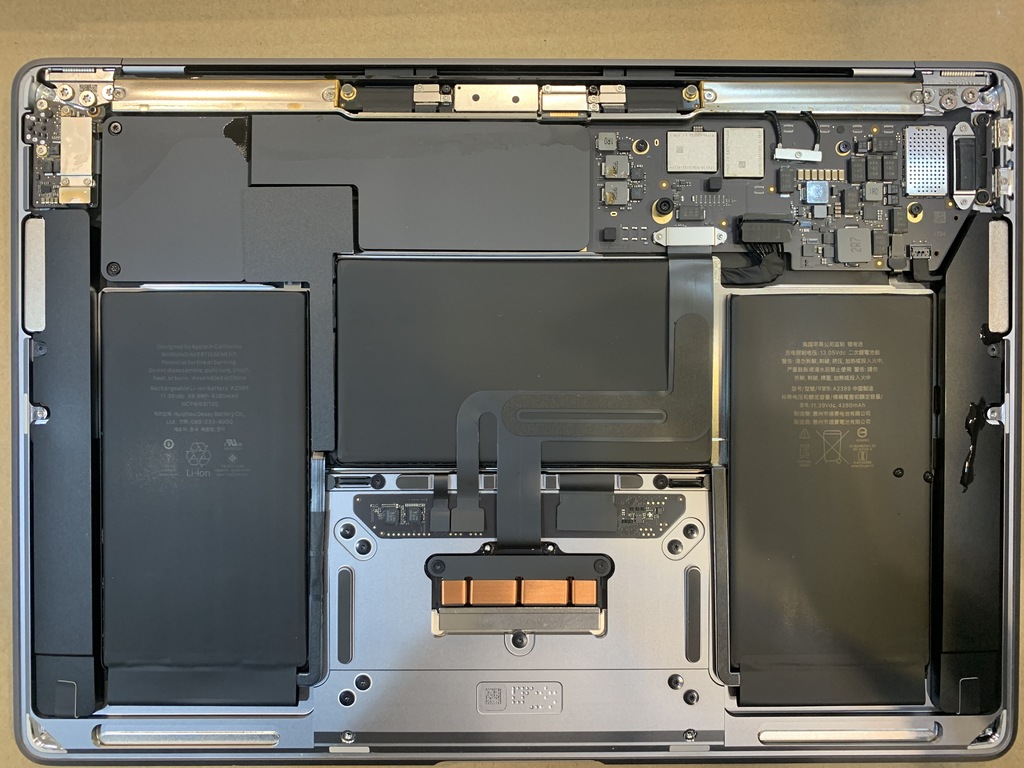 아이고~~~ 맥북 m1 에어 기종의 경우에는 오디오보드가 우측에 위치해 있으며, 이 부분에 지문(전원버튼)단자가 연결되어 있으므로 이 부분에 위 상황처럼 되어 있다고 하다면... 절대로 부팅은 불가능한 상태일 것입니다.