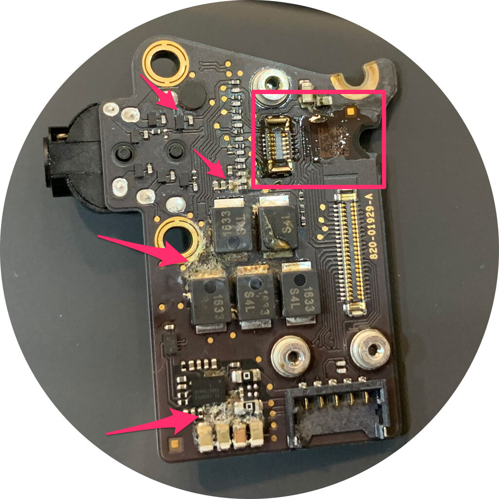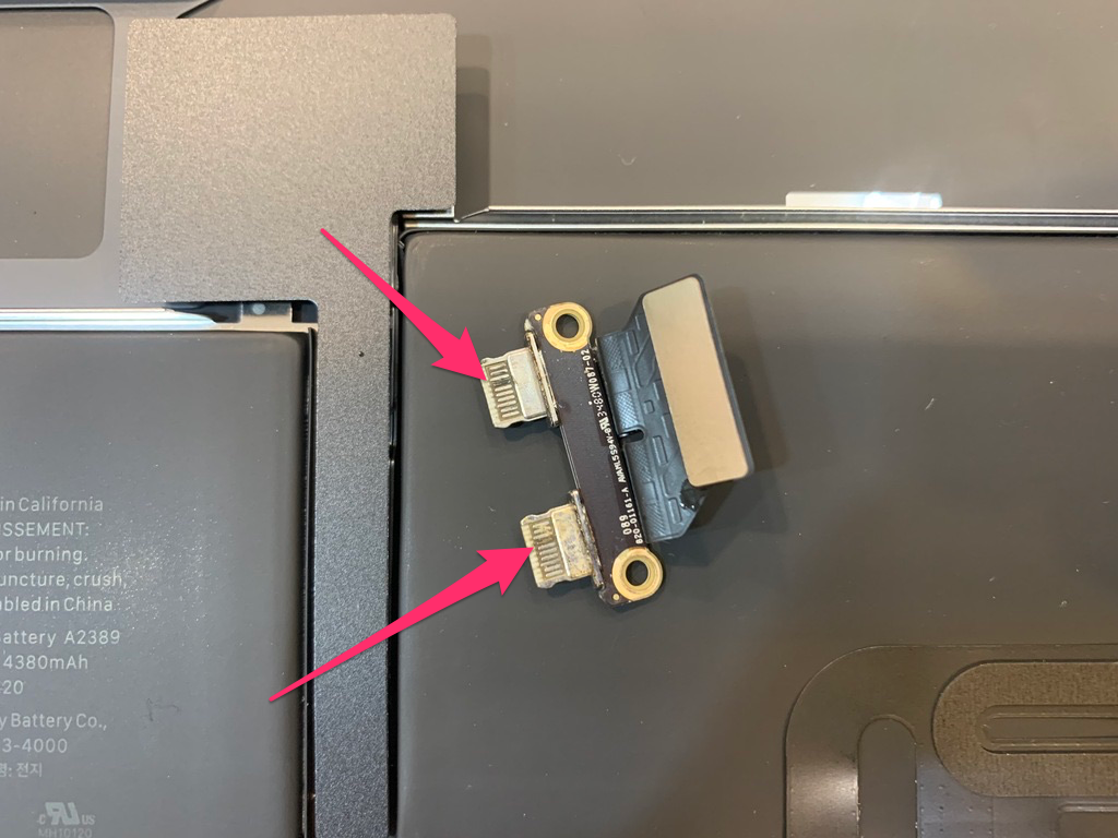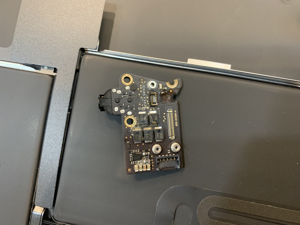 충전단자는 상당히 중요한 역할을 하며(물론 다른 부품들도 다 중요합니다만) 이 부분이 고장나면 배터리가 100% 있더라도 맥북이 켜지지 않는 상황이 발생할수 있으니 침수된 맥북은 반드시 이 부분을 분리해서 수리 혹은 교체작업을 해야 합니다.